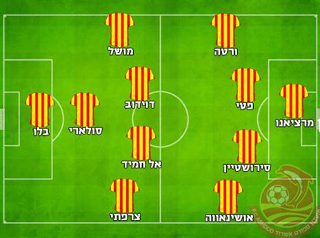 הרכב משוער: איתמר ניצן; קובי מוסא, עשהאל בן שבת, מאיר גבאי, אורי שטרית; חסן אבו זייד, בן רייכרט, תום מנשרוב, קני סייף, בן בן יאיר; אמיר האדזיץ'.
