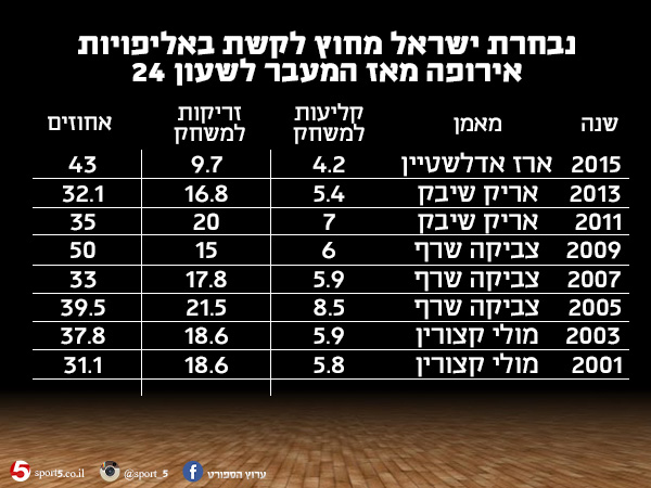 באליפות אירופה האחרונה ב-2015, הנסיגה שלנו בלטה באופן ברור. ישראל אמנם הובילה את התחרות באחוזים מחוץ לקשת (43%) אך מצד שני, הנבחרת קלעה 4.2 שלשות בלבד במשחק. היא הייתה היחידה באליפות שקלעה מתחת לחמש שלשות במשחק וזרקה פחות מעשר (9.7). לצורך השוואה, נבחרת הולנד, הקבוצה שזרקה הכי מעט מחוץ לקשת מלבד ישראל, עשתה זאת 14 פעמים במשחק.