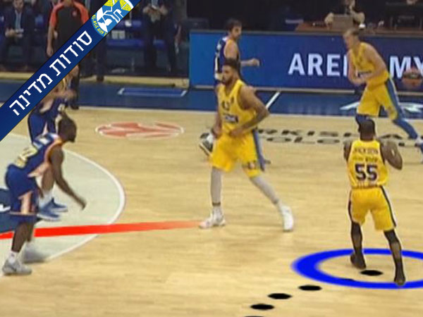 נתחיל עם מהלך מהמשחק מול ברצלונה. מכבי תל אביב תריץ תרגיל שבמסגרתו עולים שני הגארדים (קיין ורול) על חסימות של שני גבוהים (טיוס ותומאס). שימו לב איך, למעשה, מקבל קיין חסימה משולשת (טיוס, רול ותומאס). במקביל הביטו על העלייה של רול על החסימה של טיוס, בדרך לחדירה ומסירה נאה פנימה.