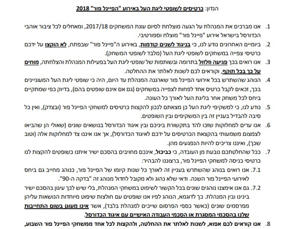 כרטיס אחד לפחות לכל אחד משופטי ליגת העל (וזאת בנוסף להסדרים הקיימים ביחס לשופטי המשחק)", המשיכו השופטים. "נבהיר, כי ככל שעל אף פנייתנו זאת, תסרבו לבקשתנו לשימור הנוהג הקיים ביחס להקצאת הכרטיסים, נראה עצמנו משוחררים גם אנו משימור נוהגים אחרים, לרבות ביחס לחולצות השיפוט בהן ייעשה שימוש במשחקים (ומשחקי הפיינל פור השבוע בכלל זה)".