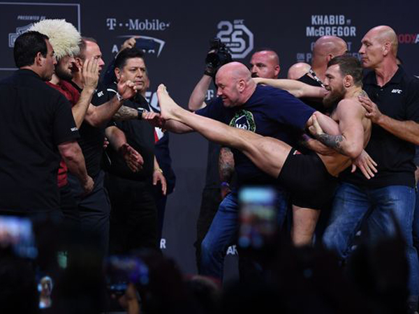 נשיא ה-UFC דיינה ווייט ביקש בכל לשון של בקשה שלא יגעו אחד בשני, אבל כשמקגרגור בסביבה אף אחד לא בטוח. האירי התקרב לאלוף הדגסטני והכה אותו על ידו, רגע לפני שהמאבטחים זינקו והפרידו בין הצדדים. גם הראפר דרייק שהגיע עטוף בדגל אירלנד, לא נשאר אדיש למהלך העניינים.