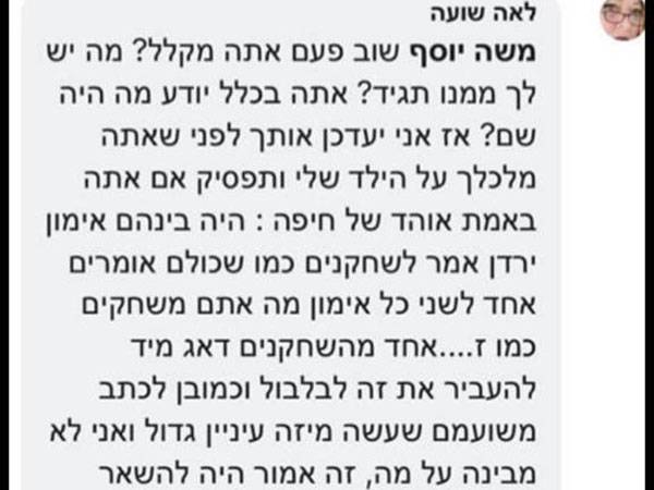 בינתיים, אמא של החלוץ, לאה, ענתה לאוהדים בפייסבוק על התקריות האחרונות. בין היתר כתבה: "ירדן אמר לשחקנים, 'מה אתם משחקים כמו ז**'. אחד השחקנים דאג להעביר את זה לבלבול, זה היה אמור להישאר בקבוצה. כנראה בגלל שזה שועה, אז זה יותר מעניין. חבל שמורידים לו את המורל בצורה מכוערת, ככה נהרסים שחקנים וזה קורה הרבה בחיפה".