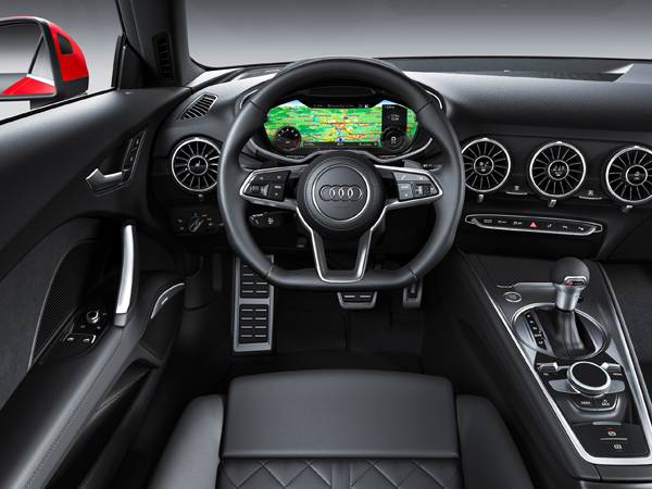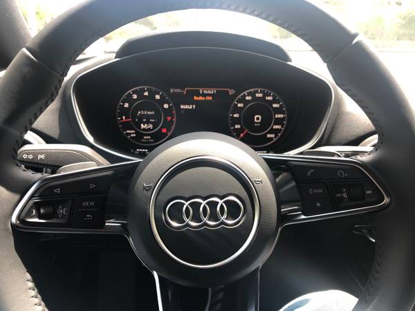 גם תא הנוסעים מצליח לשדר את השקט הזה. הוא אמנם מפואר ומרשים כמצופה מאודי, וזאת באמצעות עור מקיר לקיר ופלסטיקה איכותית להפליא, אבל יש בו גם מינימליזם מסויים. כך למשל, ובשונה מ-99% מהמכוניות שנמכרות בישראל, אין ב-TT מסך מגע מרכזי, והמסך היחיד במכונית נמצא מאחורי ההגה. המסך הזה, שנשלט בידי בורר במרכז הקונסולה, אמנם עושה פחות או יותר את כל מה שהיה עושה מסך מרכזי בכל הנוגע לפונקציות השונות של המכונית, אבל עדיין מדובר בסוג של אמירה. הדבר היחיד שלא נמצא עליו הוא התצוגה של בקרת האקלים שמבוססת על שלושה מסכונים קטנטנים שיושבים במרכז פתחי האיורור העגולים שממלאים את הדשבורד. תחתם נמצאת שורת מתגים קטנה לצורכי מצבי נהיגה, בקרת אחיזה וכו' וזהו. אהבתי מאוד את הסידור הזה שהוא לא רק מקורי ויפה אלא גם (לטעמי לפחות) הרבה יותר בטוח ממסכי המגע שגורמים לנהג להתעסק עם תפריטים במקום עם ההגה.