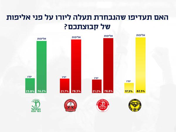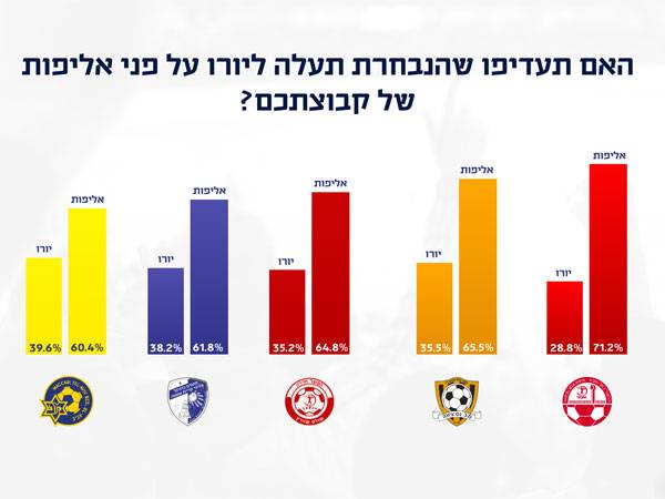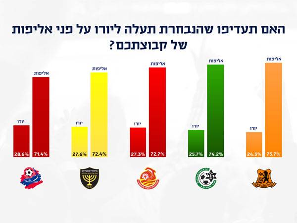 25.7 אחוזים בלבד מאוהדי מכבי חיפה המיוסרים מוכנים לדחות את הקץ פעם נוספת ולראות את הנבחרת ביורו על חשבון אליפות לה הם כה משתוקקים. כך גם אצלי אוהדי בני יהודה, ש-24.3 אחוזים בלבד מוכנים לוותר העונה על אליפות שניה בהיסטוריה וראשונה מזה 30 שנה.