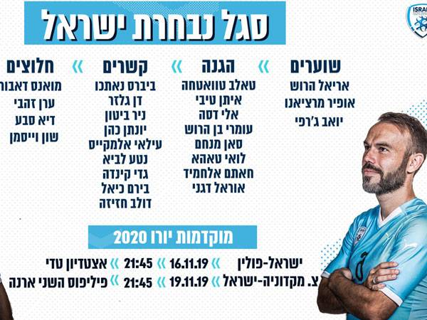 נבחרת ישראל תסיים החודש את הופעותיה במוקדמות יורו 2020 - במשחק בית מול פולין ומפגש בחוץ עם מקדוניה הצפונית. היום (רביעי) נחשף הסגל בלי יותר מדי הפתעות. המכה העיקרית לנבחרת היא אי היכולת לזמן את מנור סולומון, שסובל מפציעה רצינית בשריר אחרי שנפצע במשחק הליגה האחרון של שחטאר דונייצק. הקשר הצעיר צפוי להיעדר כחודש.