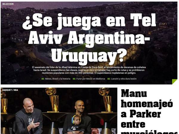 באורוגוואי, פורסם ב"אובאסיון": "אזעקות של טילים בתל אביב מעמידות בספק אתץ הקלאסיקו אורוגוואי-ארגנטינה".