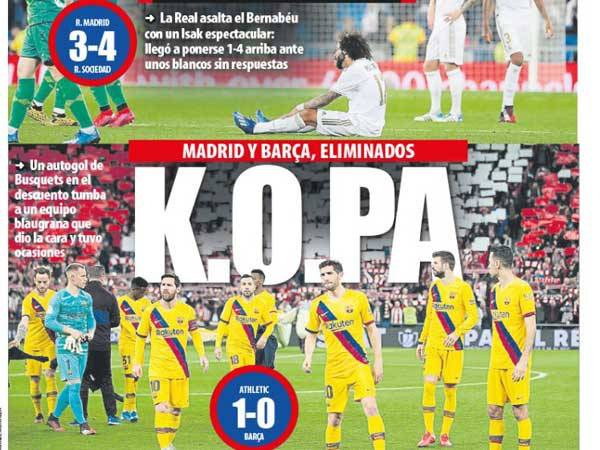עיתון "ספורט", המזוהה עם ברצלונה, התייחס בעיקר להפסד והשתמש בכותרת "אכזרי". באותו עמוד ראשי העורכים לא שכחו לעקוץ את היריבה המרה והוסיפו כותרת למטה בה היה כתוב: "שירותים בברנבאו", שזה שווה ערך ללכתוב "עשו במכנסיים".