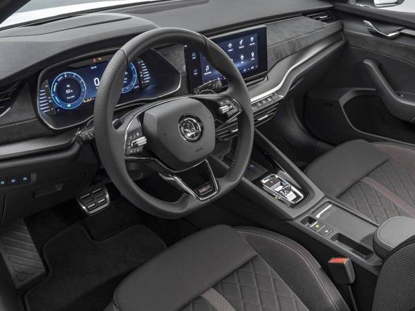 בחלל הפנים שדרוגים בלעדיים בתמה קצת קודרת עם גוון שחור עמוק כמעט בכל מקום; גלגל ההגה, מושבי העור והאלקנטרה הספורטיביים, הדיפונים וקצת קונטרסטים בצבע הדומיננטי על שיבוץ לוגואים RS בכמה נקודות בקבינה. המערכת המרכזית לה 10 אינץ' משותפת לאוקטביה הרגילה וכן תהיינה כל מערכות הבטיחות המתקדמות של היצרן. עוד בתפריט: מערכת מתלים אדפטיבית, תא מטען חשמלי, כניסה והנעה ללא מפתח, תאורת אווירה ועוד.