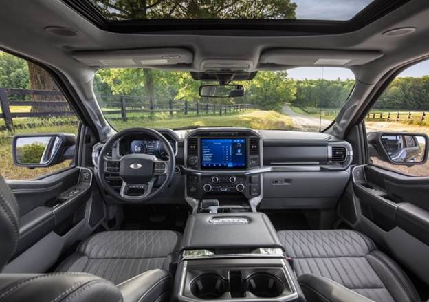 תא הנוסעים של ה-F-150 כולל את מערכת המדיה החדשה של פורד עם עדכונים מקוונים לתוכנה (מה שמייתר את הנסיעה ליצרן כדי לבצע שדרוגים לבקרת ההפעלה). במרכז הקונסולה צג 12 אינץ' מבוסס על פורד-סינק4' עם תאימות מלאה לאפל ו-אנדרויד. לוח המחוונים הדיגיטלי עודכן בתצוגה ברזלוציה משופרת וכן מצטרפות שלל בקרות בטיחות ומערכת אוטונומית למחצה (טרם הופעלה בשל הרגולציות). סידור ההושבה הוא ל-5 אנשים במבנה דאבל-קבינה מסורתי עם אופציה לזוג מושבים קדמיים מסתובבים ב-180 מעלות על הציר.
