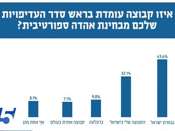 חובבי הכדורגל נשאלו גם איזו קבוצה עומדת בראש סדר העדיפויות שלהם מבחינת אהדה ספורטיבית. תגידו מה שתגידו על הנבחרת הישראלית, אבל לאוהדים עדיין אכפת. 43.6 אחוזים דירגו אותה ראשונה, לפני "הקבוצה שלי בליגה הישראלית" (32.1%), ברצלונה (9.0%), קבוצה אחרת בעולם (7.1%) ואף אחת מהן (8.1%).