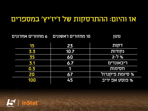 זמן לצלול למספרים. יש את ז׳יז׳יץ׳ של עשרת המחזורים הראשונים ביורוליג, ויש את זה של ששת המשחקים האחרונים. ניתן לראות הבדל משמעותי ועמוק, בכל פרמטר, בתפוקה שז׳יז׳יץ׳ נותן בתקופות האלה. נתחיל בבסיס להכל - דקות המשחק. בעשרת המחזורים הראשונים ז׳יז׳יץ׳ בילה 23 דקות על הפרקט, ובששת האחרונים - רק 15. וכאן זו ביצה ותרנגולת: האם ז׳יז׳יץ׳ מקבל פחות דקות כי הוא לא טוב, הוא שהוא לא טוב בגלל שהוא מקבל פחות דקות? שווה מחשבה.