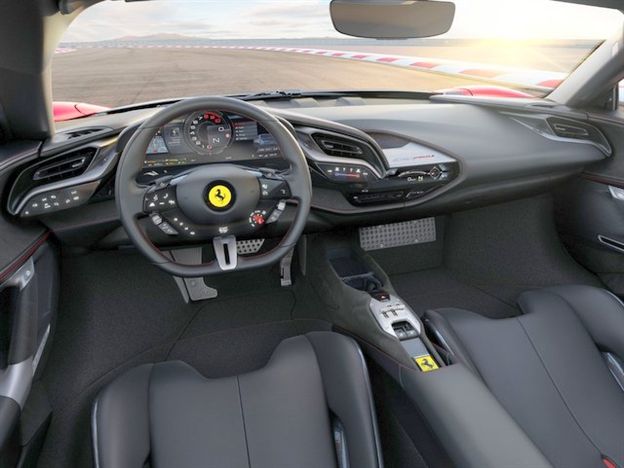 תא הנוסעים פותח בשיטת ה-HMI, שמשמעותו הצבת הנהג במרכז סביבת התפעול והתמקדות בדינמיות סביבו. זה כולל לראשונה צג דיגטלי בגודל 16 אינץ' במוטיב מתעגל שבמרכזו מד הסל"ד ומצידיו 3 תתי תפריטים עם אינפורמציה מלאה אודות מערכות הרכב. ניתן לאפיין אותו בכל מיני פונקציות בהתאם לצרכי הנהג ואף להקרין מפת מסלול על גבי המסך הראשי. מול הנהג פרארי גם הוסיפה גלגל הגה חדיש עם פקדים בסגנון טאץ'-פאד וכל הכיוונים הנדרשים לכיול המכונית עם בורר סלקטיבי בעל מצבים מובחנים.