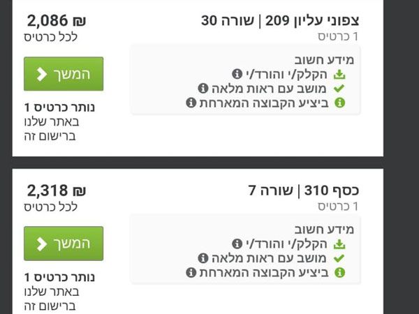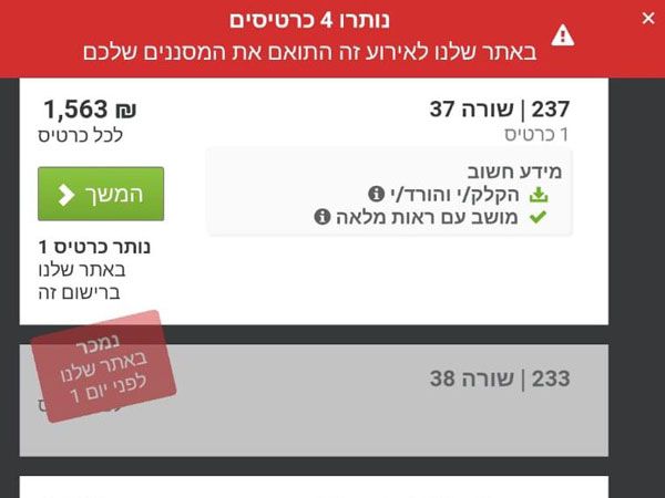 אחד מאתרי הכרטיסים הגדולים בעולם מחזיק במספר מצומצם של כרטיסים - והמחירים גבוהים מאוד. כרטיס ליציע שנמצא מאחורי השער למעלה עולה 1,854 ש"ח, כאשר מחירו המקורי נאמד בכ-100 ש"ח. כרטיס ליציע הכסף מתומחר ב-2,318 ש"ח, כשמחירו הנקוב הוא 115 ש"ח - פי 20 מהמחיר המקורי.