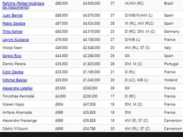אחריהם ברשימה נמצאים מרקיניוס ומרקו וראטי שמרווחים 13 מיליון ליש"ט כל אחד, אנחל די מריה משתכר בכ-12 מיליון ליש"ט, קיילור נבאס מכניס 11 מיליון ליש"ט ופרסנל קימפמבה 9 מיליון ליש"ט. יש לציין שמדובר ברשימה של העונה שעברה, ככה ששחקני הרכש החדשים לא כלולים בה. ע"פ ההערכות, ראמוס צפוי להרוויח בין 10 ל-15 מיליון יורו לשנה.