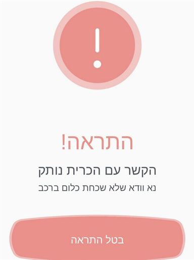 לקחתי את בתי וקפצנו לבצע מספר ניסיונות בהפרשים של כמה שעות וגם בהפרשים שנמדדו בימים, רק כדי להסיר את החשש שמא הסוללה מתרוקנת מאיזשהיא סיבה לא נראית לעין, ובכל מקרה הכרית מנתקת את עצמה באי שימוש וקיים חיווי למד הסוללה באפליקציה. שמש קופחת וטמפרטורה שנוסקת אל 70 מעלות בקבינה הם מלכודת מוות אם הילדים ננעלים/נשכחים ברכב, ולא יכולתי שלא לדמיין את הסיטואציה המזעזעת הזו שניה אחרי שטרקתי את הדלת מאחורי. פסעתי מספר צעדים קדימה ובמרחק 3-4 מטרים, ניתק חיבור הבלוטות' עם הכרית ואל מסך הסלולרי התפרצה הודעה גדולה ובולטת בשילוב צלילים. בתחתית המסך (כפי שרואים בתמונה) הופיעה התרעת משנה שאם לא יבוצע אישור, תשלח הודעת חירום לאחד מאנשי הקשר אותם סימנתי באפליקציה, וכך היה הלכה למעשה - ואיש הקשר אכן קיבל הודעה לסלולרי יחד עם קישור לוויני למיקום של הרכב ומס' הסלולרי שלי. עשינו עוד מספר ניסיונות דומים, והכרית תפקדה ללא דופי.