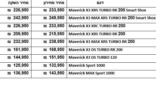 הדגם ישווק בארץ במספר גדול של קונפיגורציות, בהתאמה לצרכי הלקוח, במחירים שיחלו ב-137 אלף שקלים ועד 226,950 שקלים. כך למשל, כרטיס הכניסה לעולמות המבאריק X3 טורבו יחל עם דגם ה-120 Maverick X3 TURBO. זהו דגם בעל מנוע Rotax ACE טורבו עם קירור פנימי בהספק 120 כ"ס, דינמיקת זרימת אוויר מתקדמת ותמסורת QRS-X. כמו כל אחיו, יש בו תנוחת ישיבה נמוכה, תא נהג Ergo-LOK עם ארבעה כיוונים למושבים וכן מערכת מתלים TTX, שלדה קלת משקל ומאפייני תמרון חדים. בנוסף לכך, כולל לראשונה נעילת דיפרנציאל קדמית חכמה המאפשרת ומגיע עם צמיגי 30 אינץ'.