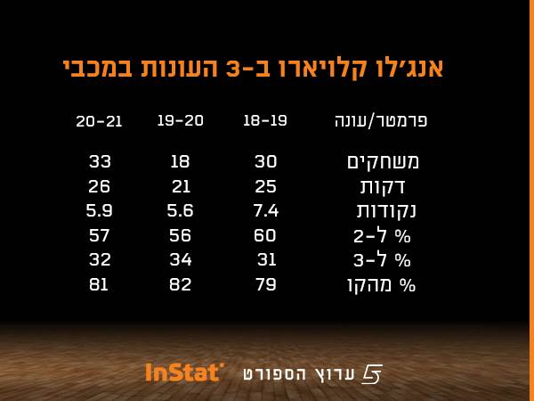אז מה אומרים המספרים? בדקנו את התפוקה של קלויארו בשלוש העונות המלאות שלו במדים הצהובים ומצאנו מאפיין בולט ששווה להתעכב עליהם: הראשון - שדווקא בעונת 19/20, עונת הקורונה שנקטעה, זו שמכבי הבטיחה מקום בפלייאוף ונלחמה על ביתיות - זו היתה העונה שבה קלויארו קיבל הכי מעט דקות בממוצע למשחק: 21 דקות לעומת 25 ו-26 בשתי העונות האחרות.