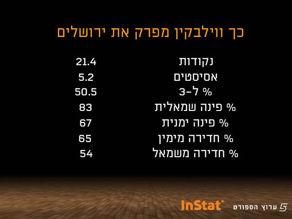 גם הסטטיסטיקה המתקדמת מראה עד כמה ווילבקין קטלני נגד ירושלים: על פי פלטפורמת הסטטיסטיקה Instat, בכל פוזשן שלו על המגרש, מכבי רושמת 1.24 נקודות, שזה הרבה. בזריקות חופשיות הוא מדייק ב-57%, וגם כששומרים עליו זה לא ממש עוזר, כי הוא קולע את רוב הזריקות - 52% מהם. במצבי קאץ׳ אנד שוט, ווילבקין מצליח ב-50% מהזריקות שהוא לוקח (רובן המכריע ל-3).
