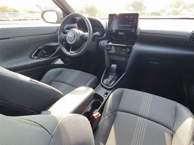 רגע לפני שלחצנו על לחצן ההתנעה ויצאנו לדרך עם הזהובה שלנו שנקראת אצל היצרן Brass Gold היבטנו סביב אל מה שקורה בתוך המכונית וגילינו שסביבת הנהג שלנו זהה כמעט לחלוטין ליאריס המוכרת וגם החומרים מהם עשויה המכונית זהים ורובם חלקי פלסטיק מודרני קשיח עם נגיעות של פלסטיק במרקמים שונים ומושבים יעילים וקשיחים בעיצוב תואם לצביעה החיצונית עם תפרים זהובים וגם כמה עיטורים של פסי פלסטיק באותו גוון מוזהב בנקודות שונות. בסך הכל, האווירה בתוך המכונית לרבות השורה האחורית שמתאימה לשני נוסעים מבוגרים ולא יותר, היא אווירה מודרנית, קודרת במקצת בגלל הצבע השחור ששולט בה, אבל איכות ההרכבה טובה מאוד כמו שאתה מצפה מהיצרן היפני בדגש על מוצרים שמיועדים לאירופאים הקפדניים.