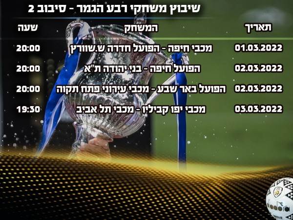 יממה לאחר מכן (2/3), ייערכו שני מפגשים מסקרנים נוספים. הפועל חיפה תארח את בני יהודה בסמי עופר בשעה 20:00 ובמקביל הפועל באר שבע תשחק בטרנר מול מכבי פתח תקווה. את השלב תנעל מכבי תל אביב במשחק חוץ ברמלה מול מכבי קביליו יפו ב-3/3 בשעה 19:30.