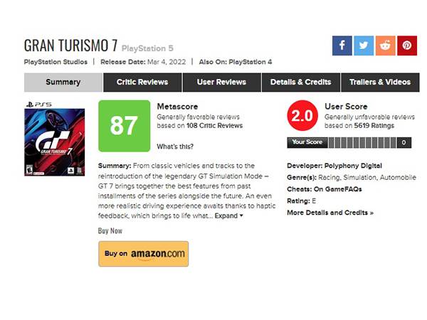 אז בזמן שאתרי הגיימינג הרעיפו שבחים על המשחק מכל הכיוונים, הגיימרים הלכו לכיוון אחר לחלוטין, וככה משחק כמו גראן טוריזמו 7, מקבל ממוצע ציונים של 87 מ-108 אתרי חדשות שונים, בזמן שהוא מקבל ציון של 2 מיותר מ-5000 משתמשים שונים באתר MetaCritic.