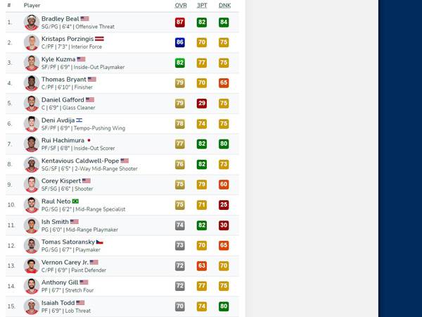 שאר הקבוצה עם ציונים מתחת ל-80. דניאל גאפורד 79, תומאס ברייאנט 79, רוי האצ'ימורה 77, נטביוס קלדוול פופ 76, קורי קיספרט 75, ראול נטו 75, איאן סמית' 74, ורנון קארי ג'וניור 72, אנתוני גיל 72, אייזיאה טוד 70, קאסיוס ווינסטון 69 וג'ורדן שאקל עם 67.