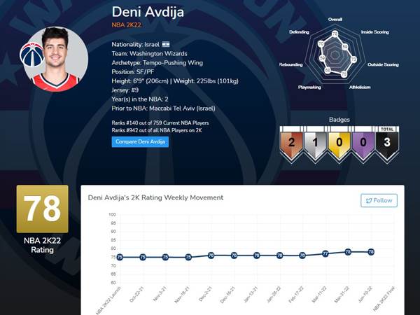 עונת ה-NBA אוטוטו מסתיימת, ואחד הדברים שהכי מעניינים אותנו לבדוק זה מן הסתם את הנציג הישראלי בליגה הטובה בעולם, דני אבדיה, וכן של חבריו לקבוצה בוושינגטון. גם NBA2K22 מתקרב לסיומו, ככל שאנו מתקרבים לשחרור הכותר הבא בסדרה בחודש ספטמבר. לעומת העונה הקודמת, השנה דני השתתף ב-82 משחקים והצליח להשכיח פציעה רצינית מהעונה הקודמת. דני התחיל את העונה עם רייטינג 2K של 75 כמו בעונה אשתקד.