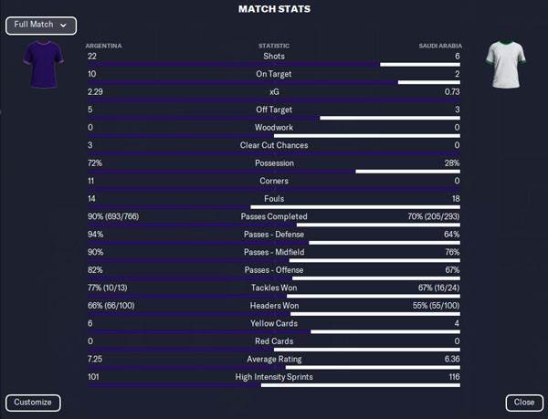 בנוסף ללחץ של ארגנטינה והבונקר של הסעודים, המשחק עצמו היה מאוד פיזי, עם הרבה עבירות מצד שתי הנבחרות. לא בהכרח צורת משחק שליונל סקאלוני לא היה מרוצה ממנו, אך ניצחון זה ניצחון.