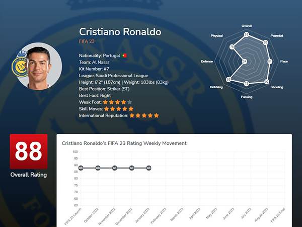 בכותר הפיפ"א האחרון אי פעם, רונאלדו קיבל דירוג של 89 בתחילת העונה, הנמוך ביותר שלו מזה 12 שנה. זוהי ירידה משמעותית מהדירוג השיא שלו, 94, אותו קיבל בפיפ"א 17 כשחקן בריאל מדריד. מאז פיפ"א 19, הדירוג של רונאלדו ירד בהתמדה, נקודה אחת בכל שנה. בפיפ"א 22 כריסטיאנו היה במקום שלישי עם דירוג של 91, ונפל עד למקום השמיני בפיפא 23 עם דירוג של 90. כעת אחרי המעבר ציון השחקן עומד על 88.