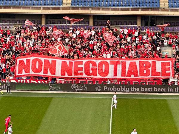 בשלטים שהונפו ביציע אוהדי הפועל תל אביב בתחילת המשחק, נכתבו המשפטים "NON NEGOTIABLE" (לא נתון לדיון/למו"מ) ושלט "מינצברג, זה הסמל שלנו בעבר, כיום ולתמיד". צפו בתמונות>>