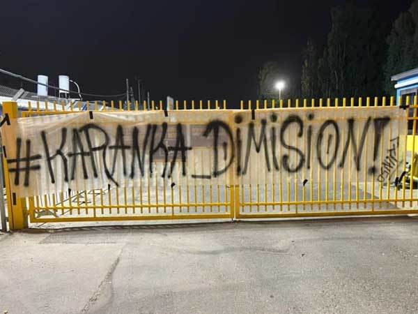 האוהדים הצהובים, שחלקם כבר החלו במחאות נגד הבאסקי בשבועות האחרונים, תלו גם הערב שלט במתחם האימונים של הקבוצה בקרית שלום ובו נכתב: "Karanka Dimision". בספרדית, הקריאה היא לפיטוריו של המאמן. כזכור, לפני כשבוע נתלה שלט נוסף בו נכתב: "קראנקה in, מנויים out. מיץ', הלקוח תמיד צודק. שחרר את קראנקה".