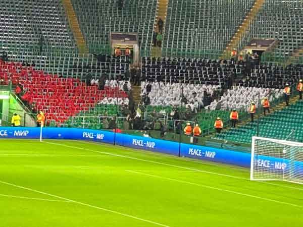 כשעה לפני המשחק, על כיסאות המושבים בסלטיק פארק נוצרה תפאורה מפלקטים שעל המושבים, ויחד יוצרים דגל פלסטין אחד גדול.