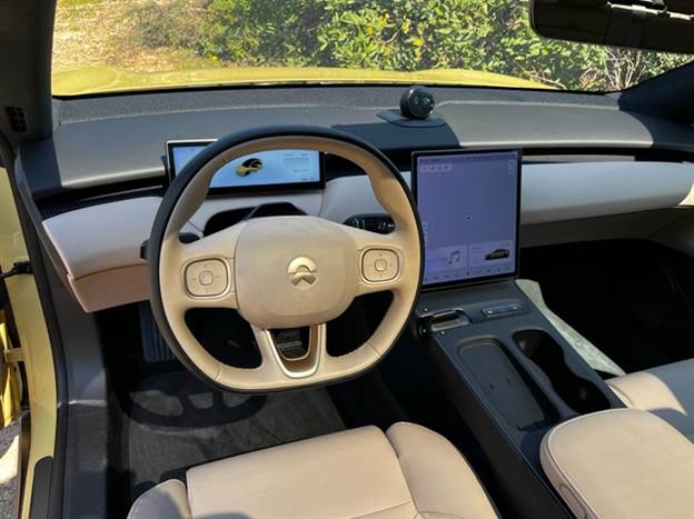 במרכז תא הנוסעים מסך "12.8 גדול ומול הנהג "10.2 של לוח מחוונים. כפתורים פיזיים? שלושה ועוד בורר הילוכים קטן. וכאן אנחנו מגיעים לדיון על מסורת. בקטנה נזכיר שבתא הנוסעים ניאו בחרה לעשות המון שינויים פיצפונים ביחס למה שאתם מכירים; הכפתורים של החלונות פועלים למשל מתחכמים (במקום לחיצה מטה לפתיחה ומשיכה מעלה לסגירה, צריך לדחוף קדימה או למשוך אחורה, בהתאמה), ידית פתיחת הדלת היא לחצן חשמלי (בדומה לזה של פיאט 500 למשל), אין למכונית סוויץ' התנעה ועוד ועוד ועוד. אפשר לחשוב שזה מגניב/מיותר (מחקו את המיותר) אבל זה לא מזיק. עם זאת יש כמה דוגמאות יותר משמעותיות ויותר מאתגרות - אפשרויות הבחירה המרובות, שכידוע היצרנים הוותיקים מעדיפים לתת כמה שפחות מהן, למשל בחירה בין מצבי נהיגה כמו ספורט/קומפורט/שלג או שאולי אתם אנשי NIO ומעדיפים לבחור גם כמה שניות ייקח למכונית שלכם להאיץ ל-100 קמ"ש? ואתם יודעים מה, למי שאינו מאותגר טכנולוגית גם זה בשוליים. אלמנט טכנולוגי אחר שמעורר יותר סימני שאלה הוא תצוגת המכ"ם שמול הנהג - היצרנים הוותיקים מציגים לנהג מעט מהאינפורמציה המרובה שהמכונית מעבדת, אך ניו בחרה בדרך משלה (דף חלק, כבר אמרנו) ושלל המצלמות והחיישנים מציגים בלוח המחוונים את התנועה שמקיפה את המכונית, כולל מכוניות חונות ואפילו חלק מהתנועה הנגדית, והכל בדיוק ובפירוט מעוררי השתאות (ר' תמונה). אבל אחרי ההתפעלות הראשונית, אי אפשר לחמוק מהשאלה על מה עדיף שהנהג יסתכל - על לוח המחוונים או החוצה.