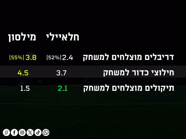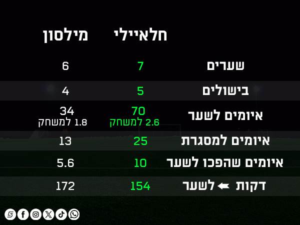 אז הפעם, לפני משחק העונה הקרב ובא, נערוך השוואה בין שני שחקני המפתח של המועמדות לאליפות ונתחיל עם המספרים בליגה שיעזרו לנו להבין טוב יותר את סגנון המשחק של השניים. חשוב לציין שבקטגוריות מסויימות חלאיילי מוביל על מילסון בין היתר משום העובדה ששיחק למעלה מ-500 דקות יותר.