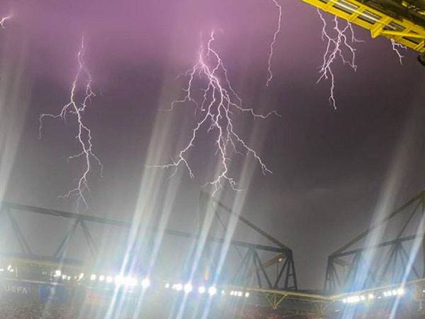 לאחר מספר דקות של ברקים שהופיעו בשמיים וגשם שהלך והתחזק, הוריד השופט את שחקני שתי הקבוצות מכר הדשא ולאחר מספר דקות גם הורה על ירידתם לחדרי ההלבשה. בסופו של דבר, לאחר כ-25 דקות, המשחק חודש.