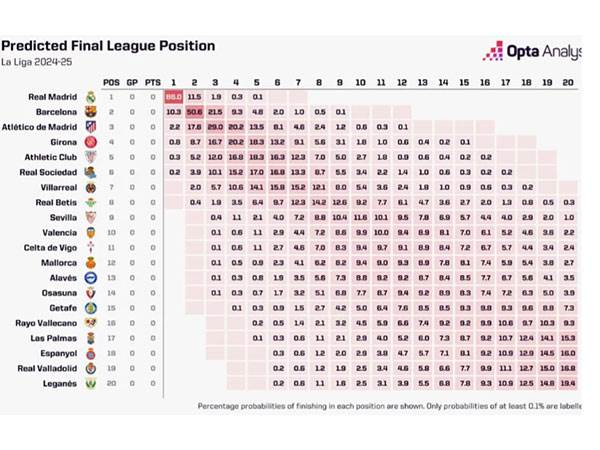 עונת 2024/25 בליגה הספרדית תצא לדרך ביום חמישי הקרוב, מחשב על מבוסס AI הריץ 1,000 סימולציות וניסה לחזות את מה שיקרה העונה: מי תהיה אלופה, מי ירדו לליגת המשנה ומי הקבוצות שיהיו בליגת האלופות. כל החישובים של OPTA כאן לפניכם.הפייבוריטית המובהקת לזכייה באליפות היא ריאל מדריד שקיבלה לא פחות מ-86% בסיכוייה לסיים במקום הראשון. ברצלונה קיבלה 10.3% בלבד לזכות וכם 50.6% לסיים במקום השני. שלוש היורדות לפי התחזית הן אספניול, ויאדוליד ולגאנס.הטבלה בסיום העונה לאחר הסימולציות:1. ריאל מדריד - 89 נקודות2. ברצלונה - 77 נקודות3. אתלטיקו מדריד - 704. ג`ירונה - 66 נקודות5. אתלטיק בילבאו - 64 נקודות6. ריאל סוסיאדד - 62 נקודות7. ויאריאל - 59 נקודות8. בטיס - 54 נקודות9. סביליה - 49 נקודות10. ולנסיה - 47 נקודות11. סלטה ויגו - 46 נקודות12. מאיורקה - 46 נקודות13. אלאבס - 45 נקודות14. אוססונה - 45 נקודות15. חטאפה - 42 נקודות16. ראיו וייאקנו - 41 נקודות17. לאס פלמאס - 39 נקודות18. אספניול - 38 נקודות19. ויאדוליד - 38 נקודות20. לגאנס - 37 נקודות