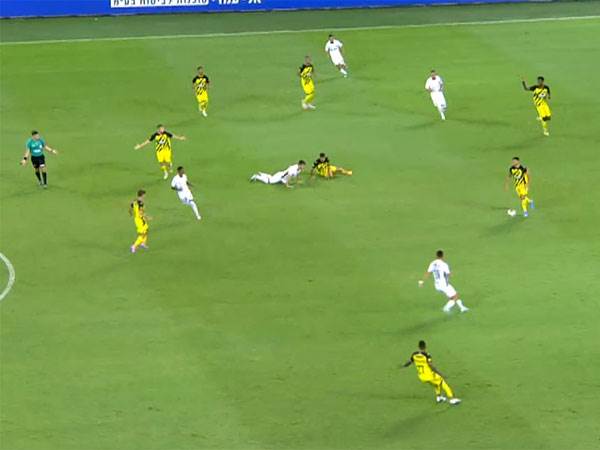 שועה רץ אחורה ומצא את עדי יונה. שימו לב לפטריק טוומאסי ליד קו החוץ.