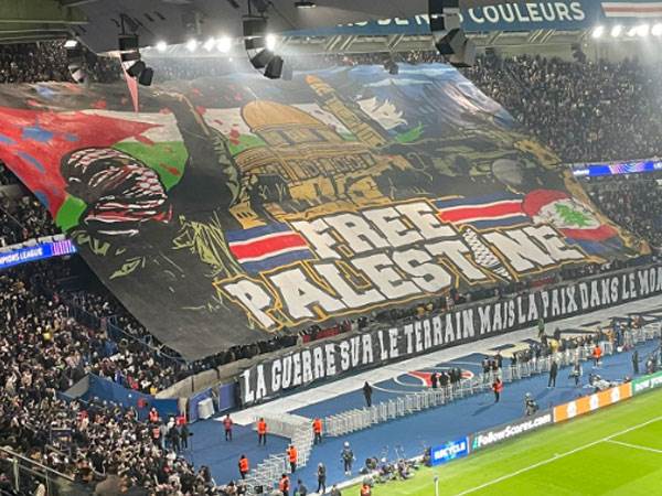 רגע לפני פתיחת המשחק הגדול בליגת האלופות בין פ.ס.ז' לאתלטיקו מדריד אמש (רביעי) בפארק דה פראנס, אוהדי הקבוצה הצרפתית תלו שלט ענק על כל היציע בעד פלסטין ונגד ישראל.