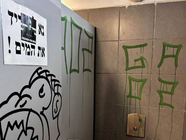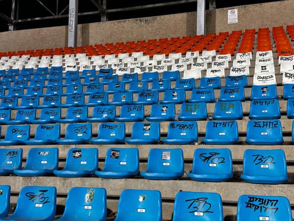 צפו בתמונות: גרפיטי רב על חפצים באיצטדיון בעכו לאחר המשחק מול סכנין