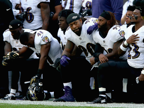 כבר אחר הצהריים הגיעה התשובה מצד שחקני ה-NFL. המשחק המוקדם של המחזור נערך בלונדון, בין בולטימור רייבנס לג'קסונוויל יגוארס ובמהלך השמעת ההמנון שחקנים רבים משתי הקבוצות כרעו ברך ואחרים מחו בצורת שילוב ידיים. בנוסף, הבעלים של היגוארס, שאהיד חאן, שהוא מוסלמי ממוצא פיקיסטני, הפגין הזדהות ושילב ידיים עם שחקניו במהלך ההמנון הלאומי.