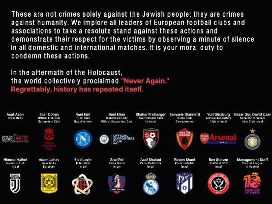 "אין מדובר בפשעים רק נגד העם היהודי; אלו הם פשעים נגד האנושות. אנו מפצירים בפני כל מנהיגי מועדוני וההתאחדויות הכדורגל האירופיות לנקוט עמדה נחרצת נגד פעולות אלו ולהפגין את כבודם לקורבנות על ידי קיום דקת דומייה בכל המשחקים המקומיים והבינלאומיים. זוהי חובתכם המוסרית לגנות את המעשים הללו. אחרי השואה, העולם הכריז ביחד 'לעולם לא שוב'. למרבה הצער, ההיסטוריה חזרה על עצמה".