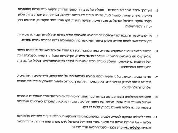המכתב נמשך בלשון תקיפה מאוד: "מנהלת הליגה בחרה לאמץ הגדרות חוקיות משלה, בעזרתם יצרה בידול מכוון בין השחקנים הישראלים, כשהיא רומסת בין היתר חוק יסוד כמו חופש העיסוק. מנהלת הליגה וארגון השחקנים בוחרים במודע להבדיל בין דם יהודי של אחד לשני על יצירת מעמד של ישראלי סוג ב' (ובשמו הרשמי - 'אזרח ישראלי חדש'), תוך קביעת הגבלות דרקוניות לקבוצות ליגת העל המעוניינות בשירותיהם".