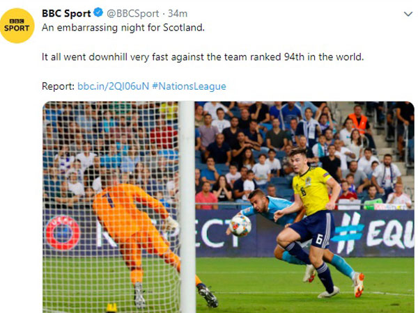"ישראל ניצחה רק פעם אחת ב-10 המשחקים האחרונים שלה. איך הפסדנו לנבחרת שמדורגת במקום ה-94 בעולם?", נכתב ב'BBC', "דווקא מול נבחרת במקום ה-94 בעולם, סקוטלנד הציגה את אחד ממשחקיה המביכים שלה. הנבחרת שמדורגת במקום ה-39 (סקוטלנד) נראתה רע מאוד מול נבחרת שמלבד ליכטנשטיין ואנדורה לא ניצחה בבית אף נבחרת מאז 2014. היא ניצחה רק את הנבחרות הכי חלשות באירופה".