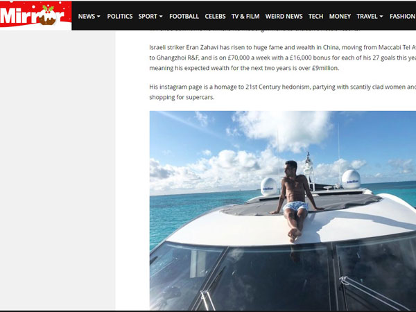 ערן זהבי ספג לא מעט ביקורת מהתקשורת הישראלית, אולם כעת הוא עולה לכותרות גם באנגליה. היום (שישי) פורסמה ב'מירור' כתבה מקיפה אודות החיים הראוותניים של כוכבי הליגה הסינית, שמשלשלים לכיסם סכומי עתק, ומעלים לרשתות החברתיות שלל תמונות שממחיש את זה.