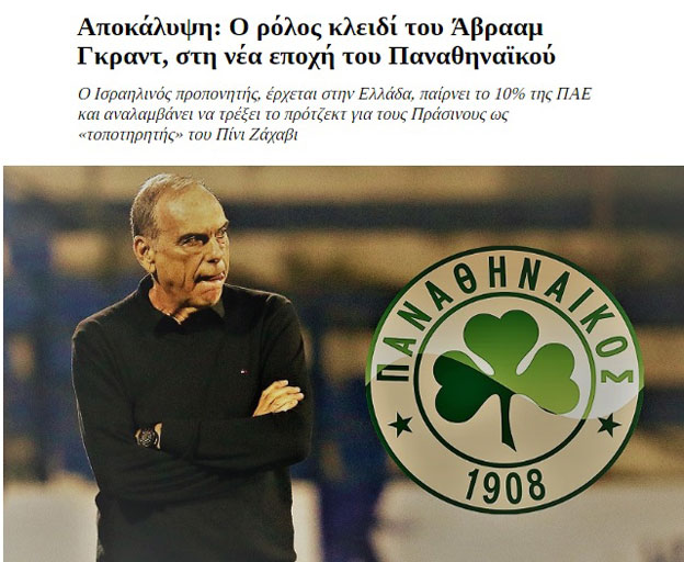 בדרך ליעד מפתיע? על פי דיווח ביוון, אברהם גרנט בדרך לפנאתינייקוס בתפקיד מנג'ר. בתחנת רדיו מקומית בבעלות בעלי הירוקים, יאניס אלפאוזוס, דווח שהקבוצה קרובה לעבור לבעלות איש העסקים פיירו פמבגונסד, שצפוי לרכוש את רוב זכויות הניהול על המועדון.