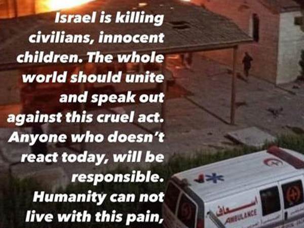 "ישראל הורגת אזרחים, ילדים חפים מפשע", הוא כתב. "כל העולם צריך להתאחד ולצאת נגד הפעולות האכזריות האלו. כל מי שלא פועל היום, ייחשב כאחראי. האנושות לא יכולה לחיות עם הכאב הזה, עם הברוטליות הזאת. ישראל, לעצור את הפשע נגד האנושות".