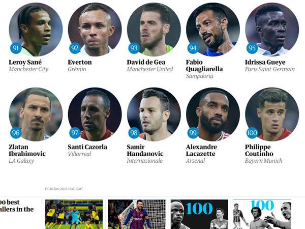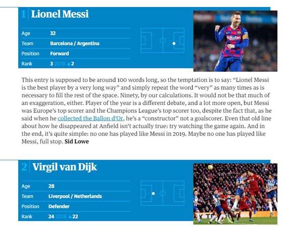 אז מסי קיבל את המקום הראשון בדירוג ומיד אחריו כמובן ואן דייק, עבורו מדובר בעלייה של 22 מקומות מהשנה שעברה. אם בקרב על כדור הזהב כריסטיאנו רונאלדו סיים שלישי הרי שלפי ה"גרדיאן" הוא רביעי בלבד (צניחה של שני מקומות) בעוד סדיו מאנה זכה לכבוד והשתחל לשלישייה (עליה של 16 מקומות) מוחמד סלאח סוגר את החמישיה, בדיוק אותו המקום בו עמד ב-2018.