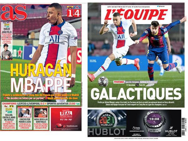 אם למישהו היה ספק לגבי הגדולה של קיליאן אמבפה, הספק התנדף לו אתמול (שלישי). הכוכב הצרפתי הענק של פ.ס.ז' הפגיז שלושער לרשת של ברצלונה ב-1:4 במשחק הראשון של שמינית גמר ליגת האלופות, ובבוקר שאחרי הוא זכה לכל סופרלטיב אפשרי והתמונה שלו הופיעה בעמוד הראשי בכל כך הרבה כלי תקשורת שונים. ובצדק.