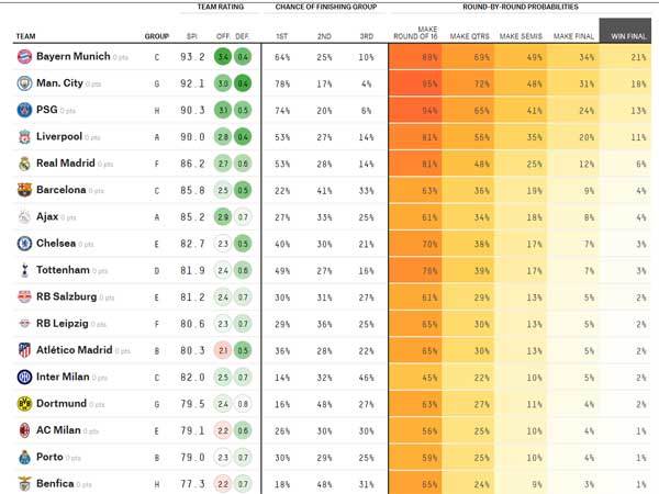 נעבור לפייבוריטיות - הקבוצה עם סיכויי הזכייה הכי גבוהים היא באיירן מינכן עם 21%, כשמיד אחריה מנצ'סטר סיטי עם 18%. את הטופ חמש קבוצות הראשונות סוגרות פ.ס.ז' (13%), ליברפול (11%) ואלופת אירופה ריאל מדריד (6%). ברצלונה, שנמצאת במקום השישי עם 4% לזכות, עומדת על 63% להגיע לשמינית לאור ההגרלה הקשה שקיבלה בשלב הבתים.