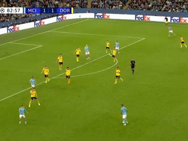 מנצ'סטר סיטי קבוצה שלוחצת גבוה, בטח במצב של 1:1 בבית. בכך היא לא שונה מקבוצות אחרות, אבל הגדולה היא בזהות השחקנים שנמצאים שם. בעת ההרמה של קאנסלו יש 6 שחקנים של סיטי שקרובים לשער, בעוד כל השחקנים של דורטמונד ברחבה. האוטובוס של השוורצגלבן מקשה מאוד, כפי שניתן לראות בתמונה מהרגע בו הכדור הגיע לקנסלו.